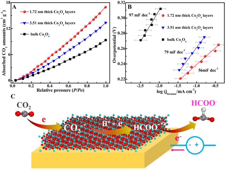 在该工作中,研究人员通过快速煅烧含钴的超薄前驱体,获得了1.72nm厚的四氧化三钴超薄二维片。超薄的厚度提供了更多的表面配位不饱和原子和更大的比表面积,从而能够促进CO2分子的吸附,进而为电催化还原反应提供丰富的原料。表面配位不饱和原子能够作为电催化活性位点有效地稳定CO2·-中间体,从而极大地改善了其电催化还原活性。超薄的厚度也有利于电子的快速转移,从而减缓了其腐蚀速率,进而增加其稳定性。此外,通过DFT计算显示,超薄四氧化三钴超薄二维片具有更加弥散的电荷密度,这有利于其导电性提高和电荷快速参与CO2的还原反应,进而有效地改善其催化活性和稳定性。该工作发表在国际著名学术期刊 (Angew. Chem. Int. Ed)上,并被选为Hot papers.