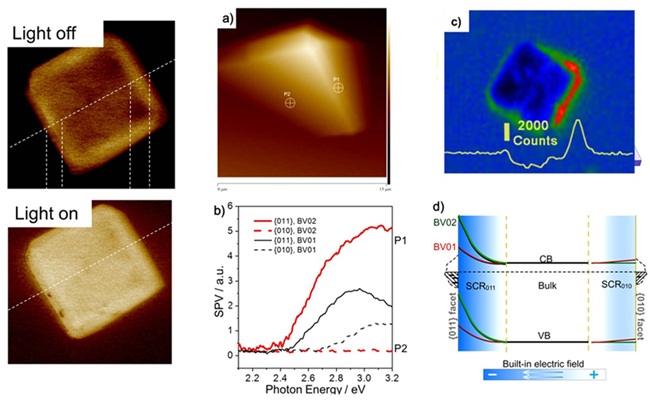 为了更深入地揭示上述体系的关键科学问题——光生电荷分离和迁移的空间特性,该团队自行发展了针对微纳尺度、单个半导体催化剂晶粒表面光生电荷空间分布研究的纳米光电成像系统——空间分辨的表面光电压谱。研究人员利用该仪器观察到BiVO4粒子上不同晶面的表面电势差异。在光激发下,空间分辨表面光电压谱揭示出半导体粒子不同晶面存在不同的空间电荷层内建电场。这种电场的存在可以使单晶粒半导体光催化剂显示超过70倍差别的空穴迁移各向异性,并进一步利用荧光成像佐证了该结果。这种内在物理特性可能是光生电荷在不同晶面间分离的主要原因。该项工作从微纳尺度上揭示了光催化剂光生电荷的分离本质,为进一步发展高效太阳能光催化制氢和二氧化碳还原等人工光合体系提供了科学基础。