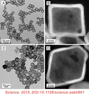 中心研究人员、厦门大学谢兆雄教授课题组与美国佐治亚理工学院夏幼南教授课题组合作,在贵金属铂催化剂制备及其电催化氧气还原反应研究方面取得重要进展,相关结果以Platinum-based nanocages with subnanometer-thick walls and well-defined, controllable facets为题,发表于《科学》 (Science, 2015, 349, 412; DOI: 10.1126/science.aab0801)。
