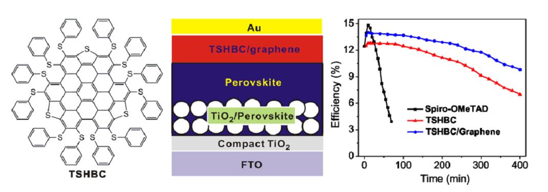 钙钛矿型太阳能电池因其优异的光电转换性能和较低的制备成本受到人们的广泛关注与研究。该项合作研究成功地将功能化纳米石墨烯分子应用于钙钛矿太阳能电池的空穴传输层,作为一类全新的空穴传输材料,在无掺杂的条件下所制备的钙钛矿太阳能电池可获得12.8%的光电转化效率。通过石墨烯片掺杂,该钙钛矿电池的光电转化效率可以进一步提高到14.0%。充分利用纳米石墨烯分子具准确结构、易化学修饰调变其能级的特点,通过对比同系列的全硫醇化纳米石墨烯,证明了HOMO(最高填充轨道)能级是决定太阳能电池效率的关键因素之一,而铅-硫键的形成有利于空穴从钙钛矿到纳米石墨烯分子的转移,石墨烯片的加入可提高空穴的传输性质。此外,硫醇化纳米石墨烯的疏水特点使所制备的钙钛矿太阳能电池的稳定性得到进一步的提升。器件本身可以在光照为AM 1.5G和湿度45%的条件下正常工作,无需封装。该研究结果为今后功能化纳米石墨烯乃至石墨烯材料在钙钛矿电池中的应用提供了新的思路。