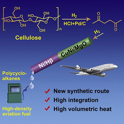木质纤维素作为一种可再生碳资源,将其转化为运输用液体燃料对保证我国能源安全和我国的二氧化碳减排均非常重要。在本工作中,科研人员首次报道了一种将不可食用的纤维素转化为高密度航空煤油的方法:首先,采用氢解反应高选择性地将纤维素转化为2,5-己二酮,并通过反应分离的方法,最终获得71.4%的2,5-己二酮分离碳收率;随后,采用一个双床层催化系统通过羟醛缩合-加氢-加氢脱氧反应,将2,5-己二酮转化为具有支链结构的C12和C18的多环烷烃燃料,碳收率为74.6%。该过程获得的多环烷烃具有高密度(0.88g/mL)和低冰点(225K)的特性。在实际应用中,该产物可作为高密度先进航空燃料单独使用;亦可以作为燃料添加剂,提高航空煤油的体积热值。