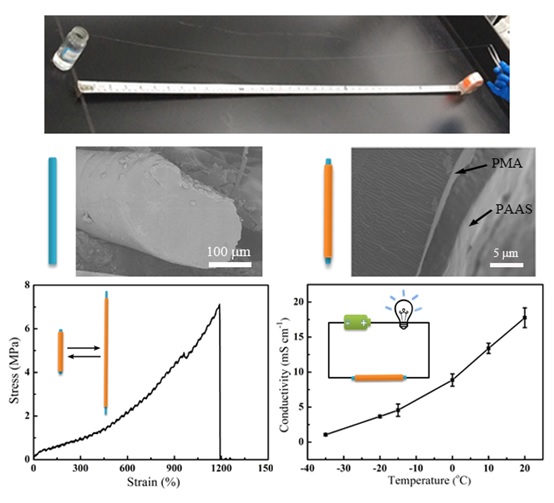 蜘蛛丝具有多层次的有序结构,从而表现出优异的力学性能。受蜘蛛丝的有序结构和纺丝方法的启发,iChEM研究人员、中国科学技术大学马明明课题组通过凝胶纺丝的方法,实现了调控导电水凝胶中高分子链的排列和取向、制备出高性能导电水凝胶纤维的目标:在室温下由聚丙烯酸钠(PAAS)溶液直接纺丝得到水凝胶纤维,通过涂覆聚丙烯酸甲酯(PMA)防水层,形成具有核-壳结构的PMA-PAAS水凝胶纤维(MAPAH纤维)。在MAPAH纤维中,PAAS结晶区和非晶区共存并且可以快速可逆互变,使MAPAH纤维表现出优异的机械性能、导电性能以及抗冻性能。MAPAH纤维具有高拉伸强度(5.6 MPa)和大断裂伸长率(1200%),并且可以在大幅度拉伸后快速回复。PAAS水凝胶作为导电芯(电导率为2 S m-1),PMA层作为防水和绝缘涂层,使MAPAH纤维可以作为具有高可拉伸性的弹性导线。MAPAH纤维在-35 oC也能保持其可拉伸性和导电性,表现出优异的抗冻性能。作为一种高性能和低成本的弹性可拉伸导电水凝胶纤维,MAPAH纤维将可用于开发基于纺织材料的可拉伸电子器件。