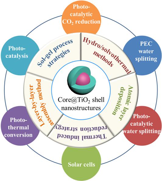 该综述全面阐述了应用于太阳能高效利用的核壳结构氧化钛纳米材料的研究进展。系统介绍了核壳结构氧化钛纳米材料的合成方法,包括传统的溶胶-凝胶法、水热、层层组装法,以及近年来发展的溶剂热法、原子层沉积法以及热诱导还原法,深入探讨了核壳结构氧化钛纳米材料在光催化、光解水、光催化CO2还原、太阳能电池以及光热转换等领域的应用研究。他们还对核壳结氧化钛纳米材料的设计合成以及在太阳能高效转化和利用方面的发展趋势和前景做了展望。