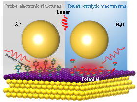 多相催化剂的表界面结构决定其催化性能。构造明确的表界面结构,借助原位谱学技术从原子、分子水平上对表界面结构和过程进行表征,揭示结构对反应的影响,对科学设计、合成高效催化剂有重大意义且极具挑战性。该工作首先在具有确定表面状态和电子结构的Au(111)、Au(100)及Au(110)模型单晶表面上构建了不同层数的Pd/Au和Pt/Au异质结构,以异氰苯作为探针分子,充分利用SHINERS技术的优势,详细分析了该双金属模型界面的电子结构。进一步利用原位电化学SHINERS技术,原位监测了双金属Pt/Au、Pd/Au及三金属Pt/Pd/Au模型界面上电催化氧化反应过程。发现缺电子状态的单层Pt、Pd表面有利于削弱Pt-C、Pd-C作用,从而削弱CO毒化作用,显著提升其催化性能。该工作表明SHINERS可作为一种重要的表界面电子结构分析的新方法,为揭示反应机理提供直接证据。