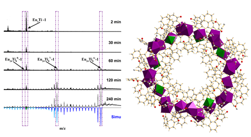 分子模块组装是构筑大分子团簇的一种有效方法。然而,由于涉及大量小分子的参与,难以预测参与反应的分子是否可以形成分子模块以及这些形成的模块可否进一步组装。课题组利用时间分辨的高分辨电喷雾离子源质谱(HRESI-MS)跟踪了四异丙醇钛、乙酰丙酮铕和水杨酸在乙腈溶液中的分子组装过程,揭示了上述反应不仅可以形成Eu3Ti模块基元,而且该Eu3Ti模块基元可以进一步组装成环状的Eu24Ti8团簇。基于上述质谱结果,课题组采用水热法成功合成了迄今为止最高核环状稀土-钛氧团簇Eu24Ti8,该团簇由八个Eu3Ti单元头尾相连,具有准八重对称性,环的外径4.1nm,内径0.9nm,厚度1.6nm。该研究工作对于快速、高效合成高核金属团簇具有重要的指导意义。