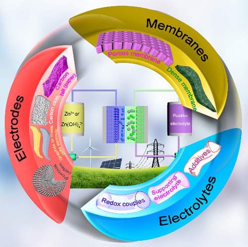 储能技术是分布式能源系统的关键核心技术。以金属锌为负极的锌基液流电池体系具有成本低、能量密度高等优势,受到了越来越高的关注。目前,锌基液流电池发展迅速,有多种类型,主要包括锌卤素(溴、碘)液流电池、锌镍单液流电池、锌铁液流电池等。该综述详细总结了锌基液流电池的发展现状以及存在的挑战,重点介绍了锌基液流电池关键材料包括电极、离子传导膜、电解质溶液等最新进展及其对锌基液流电池性能的影响,并对锌基液流电池未来发展方向进行了展望。