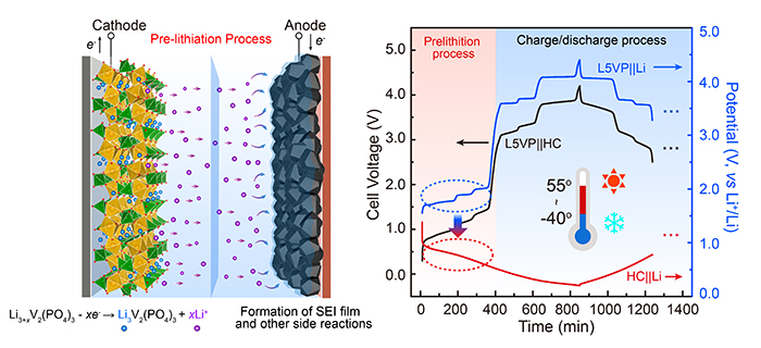 中国科学院大连化学物理研究所储能技术研究部(DNL17)张华民研究员、李先锋研究员、张洪章研究员团队与中国科学技术大学火灾科学国家重点实验室王青松教授团队合作,提出了一种利用锂化磷酸钒锂(Li5V2(PO4)3)实现“先予后取”的无添加剂自预锂化策略,并应用锂化磷酸钒锂和硬碳(HC)组成了具有高比能量、高比功率和宽工作温区的全电池。