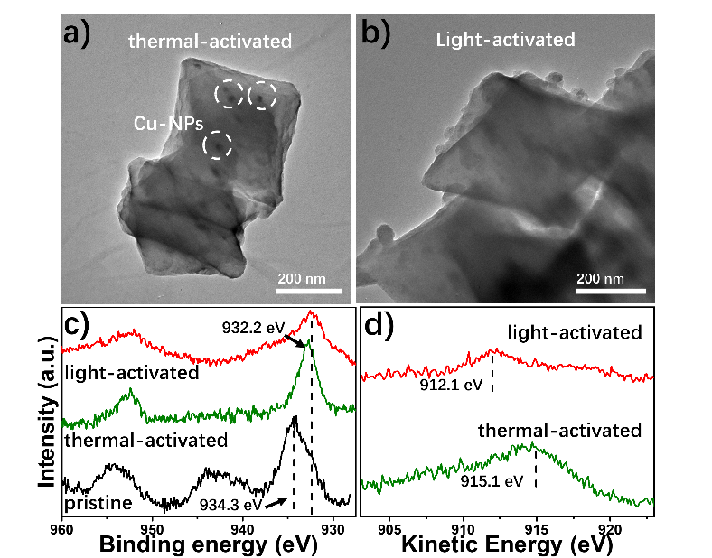 CO2的氢化过程是碳循环中重要的一环,将二氧化碳转换成高附加值的乙醇等产物倍受关注,铜被认为是二氧化碳氢化的重要催化剂。汪骋教授课题组前期利用MOF限域的铜纳米粒子开展高选择性催化产生甲醇的工作(J. Am. Chem. Soc., 2017, 139 (10), 3834–3840),并发现一价铜可以协助产生乙醇(Nature Catalysis, 2019, 2, 709-717),但一价铜在反应条件下难以长期稳定,会逐渐转变为零价铜。为了解决该问题,课题组设计制备了基于MOF载体的具有光敏剂基团的铜中心催化剂。利用光敏剂在光激发时与Cu中心之间发生的单电子转移,既可以将二价铜还原为一价铜,也可以将铜纳米粒子氧化为一价铜,从而稳定一价铜。X-射线光电子能谱能等印证了反应前后的铜价态,瞬态吸收光谱观察到了催化中心的电子转移过程。这项工作不仅展示了MOF作为载体的优势,也为理解二氧化碳氢化获取乙醇过程带来新的认识。
