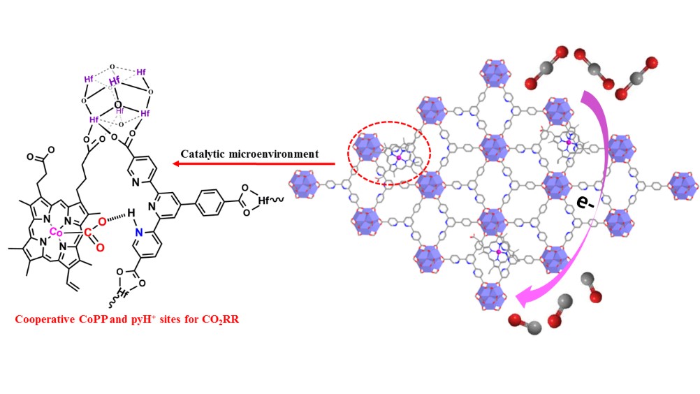在该研究中,他们在金属有机单层(MOL)的次级结构单元上修饰原卟啉钴(CoPP),巧妙地利用CoPP与MOL本身的吡啶氢位点协同催化CO2还原。结合原位红外测试、动力学实验、同位素实验以及DFT理论计算,证明了CoPP和MOL上的吡啶参与了CO2活化中间体[pyH+--O2C-CoPP]的形成。MOLs的结构特点使设计这一独特的催化位点成为了可能。
