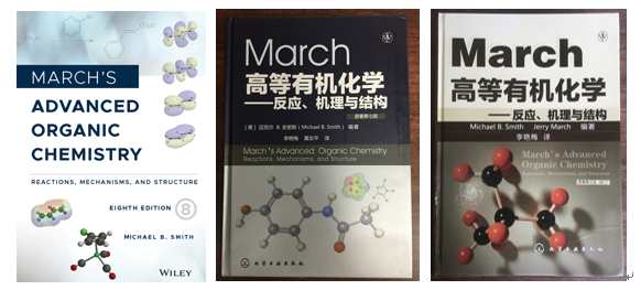 注:《March’s Advanced Organic Chemistry》1969年发行第1版,前4版由Jerry March教授编写。1997年March教授去世后,Michael B. Smith继续了这个系列教科书的出版事业。该书在国际上被广泛使用,是非常实用的有机化学教材,全面总结了有机化学反应和机理,适合作为高年级本科生和研究生的有机化学教材,也是基础有机化学本科生课程的教师用书。在维基百科列出的化学领域重要书籍清单的八本有机化学书籍中,《March’s Advanced Organic Chemistry》位列第二。Chemistry & Industry评述“Who can hope to be seriously accepted as a member of the organic chemistry community without being in possession of at least one edition of ‘March’?”。该书的第8版已于2019年12月发行电子版,纸质版将于2020年1月28日出版。其中,第五、七版已由李艳梅、黄志平教授译为中文版,在我国也有广泛影响力。