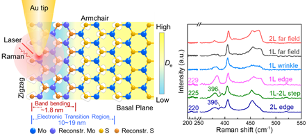 在该工作中,任斌教授课题组通过针尖增强拉曼光谱(TERS)对薄层MoS2一维缺陷(边缘,台阶和褶皱等)进行高空间分辨的成像,获得了互相关联的AFM形貌与TERS光谱信息,系统研究了不同缺陷位的结构与电子性质。研究发现,与单层MoS2的边缘和褶皱相比,两层MoS2的边缘和一层-两层之间的台阶位具有独特的电子-声子相互作用,从而导致缺陷位附近~1.8 nm范围内材料的能带发生弯曲。缺陷位具有特殊电子能带结构以及高化学活性(如氧吸附),与完美的晶格结构相比具有较低的电子密度,从而在缺陷位和完美晶格结构之间形成10~19 nm范围的自由电子扩散长度。此外,该工作还利用对缺陷结构和电子性质敏感的拉曼振动模的谱峰位移,发展出可以区分不同类型的MoS2边缘(zigzag和armchair)的方法。该工作表明了TERS在原位、高空间分辨表征缺陷位的结构和电子性质方面具有独特的优势,可以进一步推广到其他二维材料,从而有效地指导缺陷设计和材料应用。