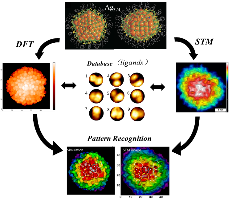在本工作中,该研究团队以原子结构精确的 Ag374纳米团簇作为研究对象,利用低温超高真空扫描隧道显微镜分别在LHe及LN2温度下获得了单个团簇亚分子高分辨率的拓扑图像。结合 LN2温度下单个叔丁基苯硫酚(TBBT)分子在 Au(111)表面的高分辨 STM 图像以及 Ag374的 DFT 理论 STM 图,证明 Ag374的高分辨 STM图中呈现出了单个 TBBT 的形貌,并且可分辨出单个甲基基团。随后,借助“图像识别”原理,通过 STM 模拟图像数据库以模板识别方法找到了高度匹配的团簇取向,此工作为将来基于应用设计功能性纳米团簇提供了指导与帮助。