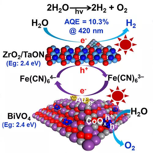 通过不断努力,该团队不仅成功拓展了Z机制全分解水制氢中产氢和产氧端催化剂对可见光的利用范围(产氢端由510nm拓展至650nm; 产氧端由450nm拓展至590nm),而且将粉末体系Z机制可见光催化全分解水制氢的表观量子效率记录不断刷新。