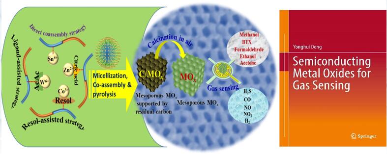 商业化两亲性分子(如Pluronic聚醚等)被广泛用作软模板剂(即造孔剂)来合成常见的二氧化硅、碳基介孔材料,但它们难以有效地用于合成具有丰富电子结构和表面催化活性的介孔金属氧化物半导体材料。针对这一难题,邓勇辉教授课题组利用在高分子合成方面的优势,自行合成了富含sp2杂化碳的两亲性嵌段共聚物,并以其作为软模板,发展了多种用于高效合成介孔金属氧化物半导体的新方法(J. Am. Chem. Soc., 2017, 139, 1706),合成了WO3、TiO2、SnO2、In2O3、ZnO等介孔半导体材料(Angew. Chem. Int. Ed., 2014, 53, 9035;Chem. Mater., 2016, 28, 7997;Chem. Mater., 2016, 28, 7773;J. Mater. Chem. A., 2016, 4, 15064;J. Am. Chem. Soc., 2017, 139, 10365; Adv. Funct. Mater., 2018, 28, 1705268;Adv. Funct. Mater., 2018, 50, 1806214;ACS Appl. Mater. Interfaces., 2018, 10, 1871; Micropor. Mesopor. Mat., 2018, 270, 75),这些材料分别对NO2, CO、H2S、H2、乙醇、丙酮(糖尿病人呼出气标志物)、3-羟基-2-丁酮(食源性李斯特菌挥发性代谢物)等展示了优异的气敏传感响应特性,并揭示了这些材料对特定气体的表面催化响应机理。