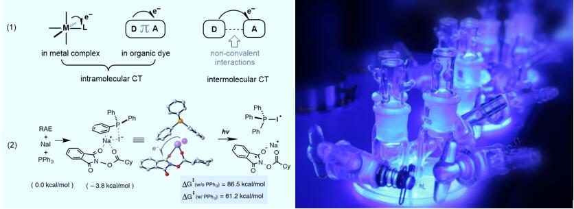 光诱导分子间的电荷转移可以通过非共价键的方式在电子给体和受体之间发生,并不限定每一个底物(给体或受体)都要在特定波长范围内具有吸收效应,只需要满足给体和受体结合形成的复合物在特定波长的范围内具有吸收即可,这样就可以简化光催化体系构成,降低催化剂成本。虽然这种光能利用方式已广泛应用于光伏器件中,但以催化还原催化循环的机制应用于合成领域仍是未被提出过的新概念。