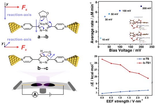 针对这一挑战,洪文晶教授课题组与程俊教授课题组合作,自主研发了精密科学仪器,将单个有机分子定向连接在两个末端尺寸为原子级的电极之间,解决了化学反应中分子取向控制的问题,通过电极对单个分子施加了高达108~9 V/m的定向电场和对反应的分子计数,精确测量了两步连续反应中每步的反应速率。在纳米尺度反应器内,若施加电场于反应轴垂直,电场对化学反应没有影响;如果电场在反应轴方向有分量,电场可以使反应速率提升超过一个数量级。理论计算结果证实了定向电场可以有效地稳定化学反应的过渡态,从而降低反应能垒。