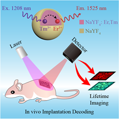 针对上述问题,张凡教授研究团队从稀土离子丰富的能级结构和能量传递机理入手,设计合成了Tm3+/Er3+共掺的稀土纳米颗粒,实现了1208 nm激发下Er3+的1525 nm下转换荧光。更重要的是通过调节Tm3+的掺杂浓度可以精确控制下转换荧光寿命。研究团队将不同荧光寿命编码的二维加密码植入老鼠皮下,利用时间门技术成功得到了信噪比较高的荧光成像效果,并且通过荧光寿命成像实现了复杂编码信息的解析。该工作不仅为稀土近红外材料的开发提供了新的手段,而且基于时间分辨调控的活体信息存储和解码技术也为近红外荧光材料未来的应用提供了新思路。