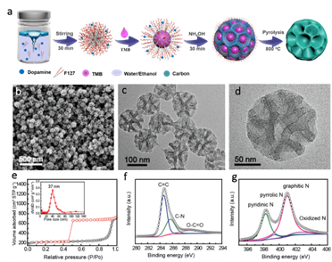 作者以商业化的Pluronic F127为模板,以多巴胺(DA)为碳源和氮源,以1,3,5-三甲苯(TMB)为调节剂,在水和乙醇的体系中合成一系列到具有可调孔径的氮掺杂碳纳米球。在合成的过程中,作者发现有机小分子(TMB)不仅对于孔隙的大小有着重要的作用,而且对于软模板(F127)和前驱物(DA)所形成的界面有巨大的影响。因此,通过调控TMB的用量可以有效控制胶束的组装方式,从而达到调控碳球孔隙和架构的目的,分别得到了光滑碳球,高尔夫形碳球,多空腔形碳球,以及树突形碳球。所合成的碳球的孔隙可以在5-37纳米范围连续调控。其中,树突形碳球具有超大的孔径(~37 nm),较小的粒径(~128 nm),高的比表面积(~635 m2 g-1),和丰富的氮含量(~6.8 wt%)。得益于这些独特的物理化学性能,其在碱性电解液中显示出卓越的氧还原性能(ORR),包括高的电流密度,优异的循环稳定性和抗甲醇性能。这种简单,巧妙的纳米微乳液合成策略对于合成新颖的纳米结构提供了新思路。