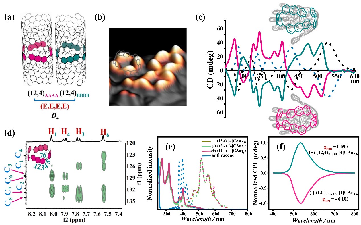 图1. [4]CAn2,6手性碳纳米大环的表征及其性质研究。(a)嵌入在相应碳纳米管中的[4]CAn2,6大环及其手性指数、单体连接单键处的立体构型、所属分子点群; (b) 3D高分辨STM图像;(c) CD光谱;(d) 2D (H, C)-HMBC NMR谱;(e) 紫外及荧光光谱;(f) CPL光谱。