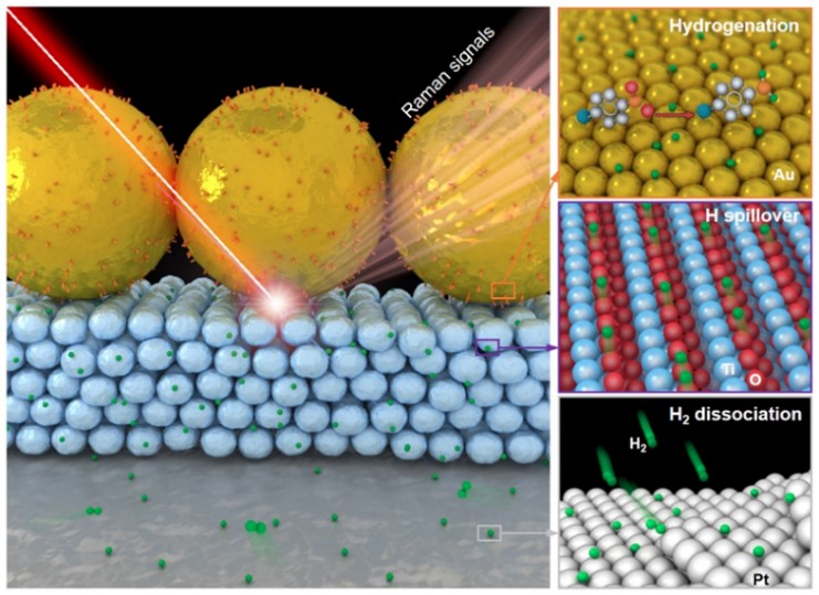 为了克服这一关键的瓶颈,李剑锋教授课题组设计了一种Au/TiO2/Pt夹层纳米结构的模型催化体系,实现了10 nm空间分辨率的拉曼光谱和氢溢流中氢活化(Pt)、溢流(TiO2)、氢化反应(Au)等活性位点的分离。以对巯基硝基苯(pNTP)还原为对巯基苯胺(pATP)为探针反应,采用原位SERS研究了界面结构对催化加氢性能的影响。原位SERS研究表明,原子氢可以有效地在Pt-TiO2-Au界面溢流,氢在TiO2表面的最终溢出距离为~ 50 nm。结合动力学同位素实验和密度泛函理论计算,发现氢的溢流是通过水辅助的表面氢氧键的断裂和形成进行的。更重要的是,可以通过控制氢的溢流距离来控制硝基或异氰基加氢的选择性。这项工作为分子层面理解界面结构对氢溢流的影响提供了帮助。