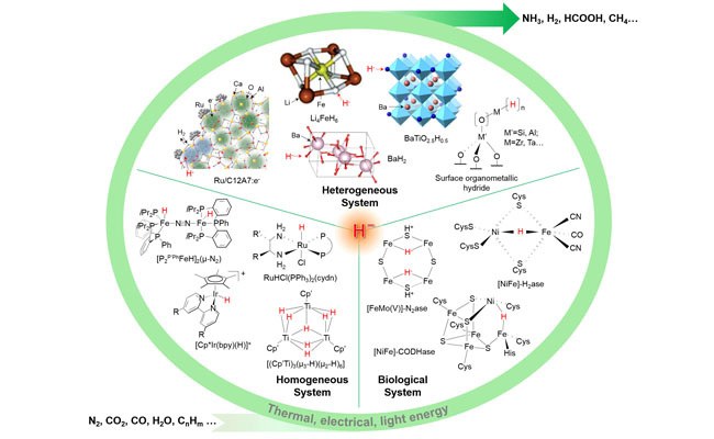 借助于热、电、光等能量的注入,将稳定的小分子(如H2O、CO2和N2)转化为能源载体(如H2、CH3OH、HCOOH和NH3等)是洁净能源可持续发展的关键。而产氢反应、N2及CO2还原反应通常需要电子、质子和能量的输入。化学性质非常活泼的氢化物正好可以通过H-、HO和H+的相互转化参与到这些极具挑战性的重要反应中去。例如,氢化物可作为质子和电子的共同来源,在多相、生物以及均相固氮过程中发挥着不可替代的作用。