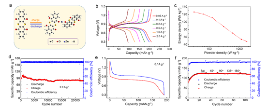 图1.(a)DTT//Zn 电池充放电机理示意图。(b)DTT//Zn电池在0.05 ~ 2 A g-1时的倍率性能。(c)能量密度及功率功率密度图。(d)DTT//Zn电池在2 A g-1时的长循环性能。(e)柔性电池DTT//Zn在0.1 A g-1时的充放电曲线。(f)柔性电池在0.5 A g-1时由平面弯曲至180o时的循环性能。