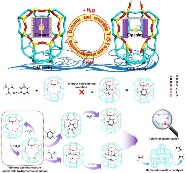 该团队首先利用17O标记的水(H217O)在温和的水热条件下(100~300 ℃)处理MTO工业应用的SAPO-34分子筛,发现水中17O原子可以和分子筛骨架上的氧原子发生交换,并且处理后样品结构保持完整,没有缺陷的产生。氧原子的交换表明分子筛骨架在水热条件下发生着动态可逆的T-O-T键的断裂-键合过程。考虑到SAPO-34分子筛是一种具有8元环小孔(孔径3.8埃)和CHA超笼结构的分子筛,并且其所有T原子都位于8元环上,研究人员利用水热条件实现T-O-T键的动态开合,将两种大体积的探针分子三甲基膦(TMP)和吡啶(动力学直径分别为5.5埃和5.3埃)封装到SAPO-34的CHA笼中。这一成功的“瓶中造船(Ship-in-a-bottle)”过程进一步证实了分子筛水热条件下T-O-T键发生着动态可逆的断裂-键合过程,同时这一技术也实现了重要的应用。该团队利用SAPO-34封装TMP进行酸性识别,实现了CHA分子筛表面由四种不同O位产生的酸性位的精准辨识,同时封装探针分子的SAPO-34用于催化甲醇制烯烃反应,大幅提高了初始烯烃的选择性。