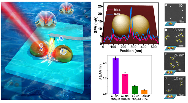 近日,大连化学物理研究所催化基础国家重点实验室李灿院士、范峰滔研究员团队利用自主研制的空间分辨的表面光电压显微镜,研究了二聚体金颗粒催化剂(Au/TiO2)的光生电荷分离过程,以及该过程中电荷的空间分布,首次发现了二聚体金颗粒和半导体光催化剂界面纳腔的电荷聚集现象,揭示了催化剂反应位点上电荷浓度对多空穴参与的水氧化反应的影响。该发现借鉴了自然光合作用中捕光蛋白和活性中心的工作机制,为人工光合成体系的设计和理解提供了新思路。