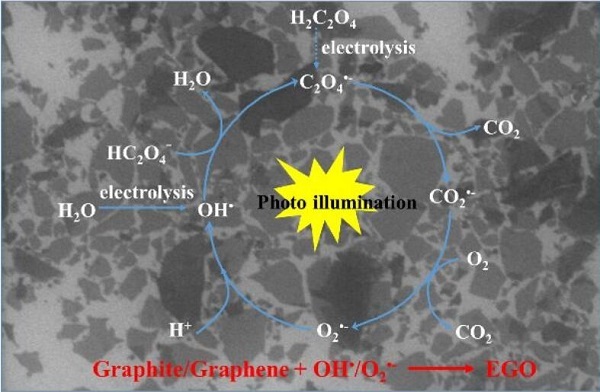 针对电化学剥离石墨过程中生成的羟基自由基(OH•)寿命短、不足以调控EGO氧化度的问题,研究团队提出了一种光电协同的约束自由基加成反应策略,即以草酸根(OA-)为插层离子和共反应剂,通过OA-和OH•的系列化学转化过程,将OH•约束在石墨-石墨烯/溶液界面并实现其再生,,有效地提高了OH•的界面浓度,使电解石墨烯和OH•之间的自由基加成反应得以充分进行;同时,由于草酸自由基具有光活性,光电协同大幅提高了OH•的再生效率,所制备EGO氧化度可控,层数少,尺寸大。红外光谱数据显示该EGO富含羟基和环氧基,而羰基和羧基的谱峰极其微弱,表明其晶体结构非常完整。