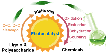 木质纤维素由多糖(纤维素、半纤维素)和木质素组成,占地球上植物类生物质的90%,是最主要的可再生碳资源。将木质纤维素转化成化学品,特别是具有高附加值的有机含氧化合物,是生物质转化利用的理想途径之一。温和条件下C−O、C−C键的选择性断键和特定官能团的定向活化是木质纤维素转化制高值化学品的关键。光催化剂吸收光能后可生成具有高氧化还原能力的光生电荷或者活性物种,在温和条件下即可实现高效高选择性化学转化。近年来,国内外多个研究团队通过光催化方法,在选择性切断多糖和木质素大分子的C−O、C−C键,高效活化木质纤维素及衍生平台分子中的指定官能团等方面取得突破,成为生物质高效利用的新兴研究领域。
