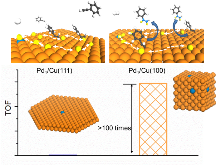 氢溢流是催化中一个重要现象。长期以来,溢流到“惰性”载体上的氢物种是否具有催化加氢活性一直存在争议。该研究团队将单原子分散催化剂与纳米表面结构调控有机结合,创制结构明确、不同表面Cu负载的Pd单原子催化剂,揭示溢流氢物种的加氢能力与Cu载体的晶面密切相关。研究发现Pd1/Cu(111)和Pd1/Cu(100)这两种催化剂在炔烃半氢化反应中均具有很高的催化选择性,但其活性却与Pd负载量呈现截然不同的依赖关系。当Pd负载量低到几十个ppm,Cu纳米片负载的催化剂几乎不具有加氢活性,但Cu纳米立方体负载的催化剂仍然拥有很高的加氢催化活性,预示着氢气在Pd中心活化后,溢流到Cu(100)晶面所形成的H物种具有加氢能力。更为重要的是,这一溢流加氢过程也同时得到了CO定量毒化活性表征以及增加Cu纳米立方体添加量可提升催化活性两方面实验的证实,形成了判断溢流加氢是否发生的有效策略。理论计算表明,除了H与表面的结合能外,炔烃的吸附能也是溢流加氢一个非常关键的因素。相对于Cu(111)表面,Cu(100)表面的s-p-d轨道杂化可以有效稳定加氢过渡态,降低反应能垒,促进溢流加氢。研究还发现,催化活性可随加入Cu纳米立方体的尺度增大而大幅提升,并证实Cu表面上氢溢流距离可大于500nm,远高于氧化物表面的氢溢流距离。为此,该研究提出了可以利用极低的Pd含量(0.005 wt%,50ppm)来激活Cu(100),使其具有高催化活性,创造出“点铜成钯”效应。该催化剂对各种取代基修饰的炔烃半加氢反应都具有高选择性,而且无论对液相或气相反应都有相当高的反应活性和选择性。