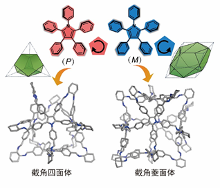 分子多面体化合物因其独特的结构、限域空间及在催化、分子识别等领域的应用而备受关注。近些年来,化学家们构筑了形状、尺寸、功能各异的分子多面体结构。但由于基本设计原则的匮乏,新多面体结构的发现仍面临挑战。近年来,曹晓宇-杨柳林联合团队借鉴数学中的面方向性多面体(Face-Rotating Polyhedra)概念,发展了以三聚茚、氮杂三聚茚、四苯乙烯等为基元的一系列分子面方向性多面体组装体系,将组装基元的二维手性传递至分子多面体的三维手性,是一类全新的分子手性形式 (Nat. Commun., 2016, 7, 12469; Chem. Commun., 2018, 54, 4685; J. Am. Chem. Soc., 2017, 139, 18142;Chem. Sci., 2018, 9, 8814)。