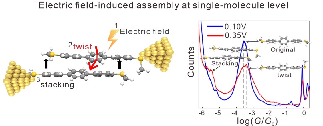 分子组装是构筑功能分子器件的关键。在促使组装体形成的分子相互作用中,p 共轭分子骨架间的堆积作用对分子间的电荷输运起着至关重要的作用。该工作基于课题组自主研发的基于机械可控裂结技术的单分子电学表征仪器装置,将高达每米1亿伏特的电场作用于纳米尺度的三联苯单分子结中。研究发现,随着电场强度的增加,三联苯分子形成组装的概率显著增加。结合DFT计算表明,单体分子在强电场下更趋于平面结构,导致组装体的结合能增加。该工作进一步分析了三苯基衍生物中存在的电场诱导分子组装现象,表明电场诱导组装效应是多种共轭分子普遍存在的现象。该工作通过在单分子尺度构筑模型分子体系,揭示了电场诱导三联苯分子组装的机制,为利用电场调节分子组装提供了一种新的策略。