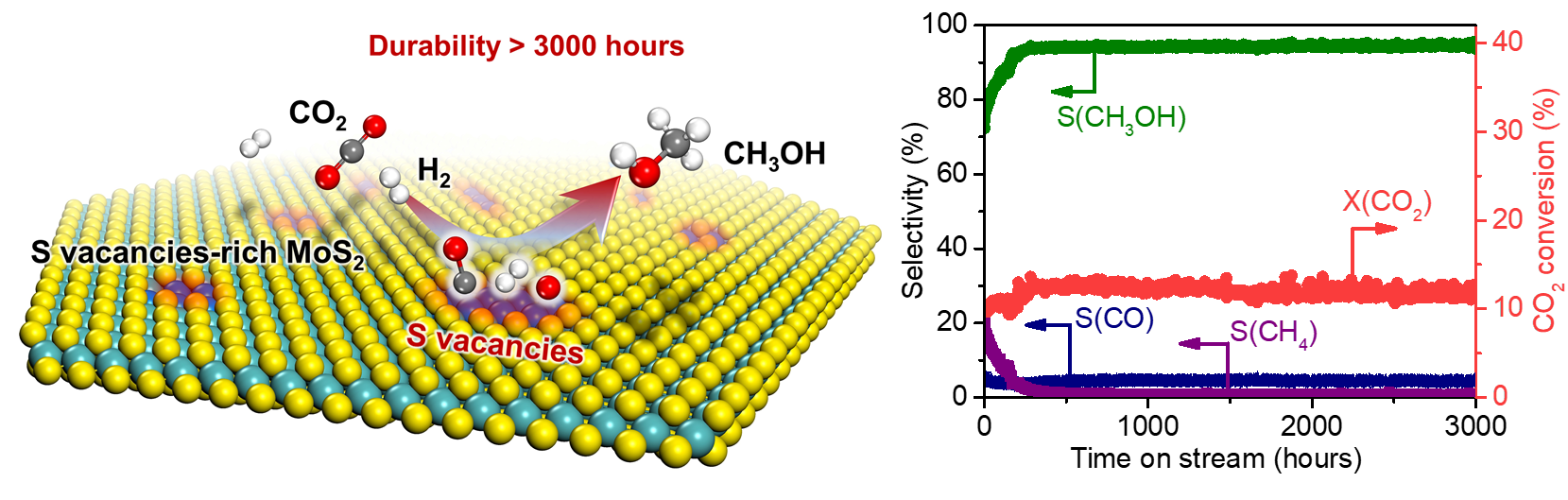 邓德会团队长期致力于二维催化材料与能源小分子转化研究,前期已在二维MoS2的催化性能调控上取得系列进展(Nat. Commun. 2020, 11, 3315; Angew. Chem. Int. Ed. 2020, 59, 10502; Nano Energy 2020, 72, 104700; Nano Energy 2019, 61, 611; Chem. Rev. 2019, 119, 1806; Nat. Commun. 2017, 8, 14430; Energy Environ. Sci. 2015, 8, 1594)。结合王野团队在C1分子的高效活化和选择转化方面长期积累的研究基础(Nat. Catal. 2020, 3, 478; Nat. Commun. 2020, 11, 827; Chem. Soc. Rev. 2019, 48, 3193; Nat. Commun. 2019, 10, 892; Nat. Commun. 2018, 9, 1181; Angew. Chem. Int. Ed. 2018, 57, 12012; Chem 2017, 3, 334; Angew. Chem. Int. Ed. 2016, 55, 4725),邓德会团队与王野团队合作研究发现,富含硫空位的少层MoS2可在低温甚至室温下将CO2和H2同时直接活化并解离,从而能够高活性、高选择性地催化CO2低温加氢到甲醇,并有效抑制了甲醇的过度加氢。该催化剂在180 oC下,CO2单程转化率可达12.5%,同时甲醇选择性可达94.3%,显著优于商品Cu/ZnO/Al2O3催化剂以及此前报道的催化剂。而且,该催化剂的活性和选择性在180 oC下能够稳定地维持3000小时而未见衰减,表现出了优异的工业应用潜力。原位表征与理论计算研究结合显示,MoS2面内硫空位是催化CO2高选择性加氢到甲醇的活性中心。该工作揭示了二维MoS2的硫空位在催化反应中的应用潜力,为开发CO2加氢新型催化剂提供了新思路。