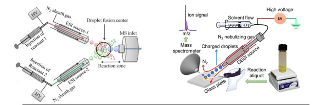 My research group has been studying chemical reactions in microdroplets and comparing the findings with the behavior of the same reaction in bulk solution. Our detection method has primarily been high-resolution mass spectrometry, although we also use nuclear magnetic resonance (NMR). Two different experimental setups are employed, one involving fusing together two streams of microdroplets (shown in Fig. l, the panel on the left), the other simply involving desorption electrospray ionization (shown in Fig, 1, the panel on the right):