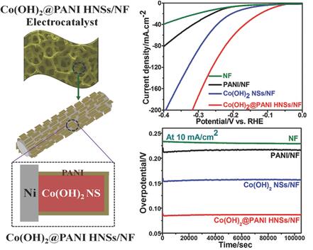 Hybrid electrocatalysts with excellent electrocatalytic activity for hydrogen reduction are fabricated using an efficient and facile electrochemical route. The electronic and synergistic effects between Co(OH)2 and polyaniline (PANI) in the composite structure are the key factors that generate the high electrocatalytic activity and excellent stability. A highly efficient, non-precious metal-based flexible electrocatalyst for high-performance electrocatalysts is shown, which reveals a novel route for the design and synthesis of electrocatalysts.