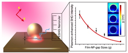 随着纳米技术的发展,几个纳米之内的纳米尺度表征具有非常重要的意义。用光学手段达到远低于衍射极限的空间分辨率具有非常大的挑战。在本论文中,作者利用等离激元增强二次谐波(PESHG)机理发展了非线性“纳米尺”,可以达到将近1 nm的分辨率。利用壳层隔绝纳米粒子Au@SiO2,通过调节壳层厚度,形成纳米尺度的纳米间隙,将间隙尺寸与PESHG信号相关联,得到“PESHG 纳米尺方程”。另外,实验和理论都证实,“热点”被转移至薄膜-纳米粒子间隙之间,确保得到的PESHG信号几乎全部来自于这一区域而且被极大地增强。PESHG纳米尺有望成为一种超灵敏光学手段来测量纳米尺度间距,并且具有很高的光谱精度和很好的信噪比。