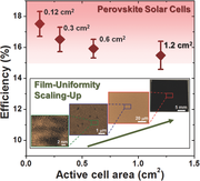 The preparation of uniform, high-crystallinity planar perovskite films with high-aspect-ratio grains over a square-inch area is demonstrated. The best power conversion efficiency (PCE) of 16.3% (stabilized output of ≈15.6%) is obtained for a planar perovskite solar cell (PSC) with 1.2 cm2 active area, and the PCE jumps to 18.3% (stabilized output of ≈17.5%) for a PSC with a 0.12 cm2 active area.