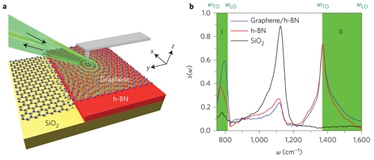 Hexagonal boron nitride (h-BN) is a natural hyperbolic material1, in which the dielectric constants are the same in the basal plane (εt ≡ εx = εy) but have opposite signs (εtεz < 0) in the normal plane (εz). owing to this property, finite-thickness slabs of h-bn act as multimode waveguides for the propagation of hyperbolic phonon polaritons—collective modes that originate from the coupling between photons and electric dipoles in phonons. however, control of these hyperbolic phonon polaritons modes has remained challenging, mostly because their electrodynamic properties are dictated by the crystal lattice of h-bn. here we show, by direct nano-infrared imaging, that these hyperbolic polaritons can be effectively modulated in a van der waals heterostructure8composed of monolayer graphene on h-bn. tunability originates from the hybridization of surface plasmon polaritons in graphene with hyperbolic phonon polaritons in h-bn, so that the eigenmodes of the graphene/h-bn heterostructure are hyperbolic plasmon–phonon polaritons. the hyperbolic plasmon–phonon polaritons in graphene/h-bn suffer little from ohmic losses, making their propagation length 1.5–2.0 times greater than that of hyperbolic phonon polaritons in h-bn. the hyperbolic plasmon–phonon polaritons possess the combined virtues of surface plasmon polaritons in graphene and hyperbolic phonon polaritons in h-bn. therefore, graphene/h-bn can be classified as an electromagnetic metamaterial as the resulting properties of these devices are not present in its constituent elements alone.