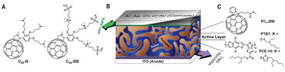 目前在有机太阳能电池中所面临的主要挑战是氧化物的稳定性与金属阴极的有效功函数之间的权衡。美国Massachusetts大学高分子科学与工程系Todd Emrick课题组最新研究表明:在单结聚合物太阳能中,在溶液相中将富勒烯吡咯烷酮与C60-N或C60-SB联合共同作为独立的阴极缓冲层可解决氧化物的稳定性与金属阴极的工作性能两者之间权衡的问题。特别是一薄层的C60-N可将银,铜和金电极有效功函数减少为3.65电子伏特。这种独立选择性阴极(Al, Ag, Cu, or Au)有机光伏电池的能量转化效率值超过8.5%。且在达到如此高的转化率时并不需要精确控制夹层的厚度,如选用C60-N或C60-SB时其夹层厚度在5-55纳米范围内均可得到高的转化率。该研究结果发表最新一期的Science上。