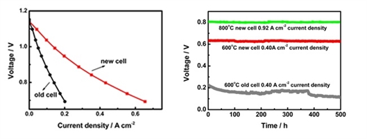 该团队研制出了LSM-YSZ微纳阴极电池,电池输出性能是传统LSM-YSZ阴极电池的2至3倍,并且在600oC至800oC下运行稳定。在LSM-YSZ微纳阴极中,纳米级LSM颗粒和YSZ颗粒的紧密接触增加了三相反应界面密度,大幅度地提高了阴极的氧还原活性。同时,纳米级LSM颗粒与纳米级YSZ颗粒的界面稳定提高了阴极在运行条件下的稳定性。