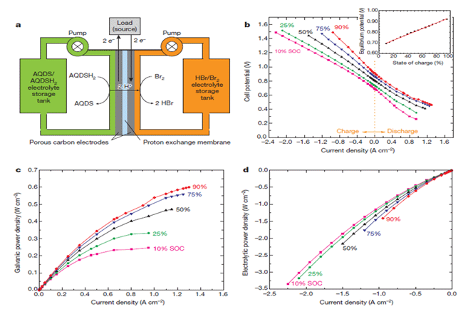 As the fraction of electricity generation from intermittent renewable sources—such as solar or wind—grows, the ability to store large amounts of electrical energy is of increasing importance. Solid-electrode batteries maintain discharge at peak power for far too short a time to fully regulate wind or solar power output1, 2. In contrast, flow batteries can independently scale the power (electrode area) and energy (arbitrarily large storage volume) components of the system by maintaining all of the electro-active species in fluid form3, 4, 5. Wide-scale utilization of flow batteries is, however, limited by the abundance and cost of these materials, particularly those using redox-active metals and precious-metal electrocatalysts6, 7. Here we describe a class of energy storage materials that exploits the favourable chemical and electrochemical properties of a family of molecules known as quinones. The example we demonstrate is a metal-free flow battery based on the redox chemistry of 9,10-anthraquinone-2,7-disulphonic acid (AQDS). AQDS undergoes extremely rapid and reversible two-electron two-proton reduction on a glassy carbon electrode in sulphuric acid. An aqueous flow battery with inexpensive carbon electrodes, combining the quinone/hydroquinone couple with the Br2/Br− redox couple, yields a peak galvanic power density exceeding 0.6 W cm−2 at 1.3 A cm−2. Cycling of this quinone–bromide flow battery showed >99 per cent storage capacity retention per cycle. The organic anthraquinone species can be synthesized from inexpensive commodity chemicals8. This organic approach permits tuning of important properties such as the reduction potential and solubility by adding functional groups: for example, we demonstrate that the addition of two hydroxy groups to AQDS increases the open circuit potential of the cell by 11% and we describe a pathway for further increases in cell voltage. The use of π-aromatic redox-active organic molecules instead of redox-active metals represents a new and promising direction for realizing massive electrical energy storage at greatly reduced cost.