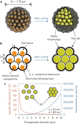 Silicon is an attractive material for anodes in energy storage devices, because it has ten times the theoretical capacity of its state-of-the-art carbonaceous counterpart. Here, we propose a hierarchical structured silicon anode that tackles all three of these problems. Our design is inspired by the structure of a pomegranate, where single silicon nanoparticles are encapsulated by a conductive carbon layer that leaves enough room for expansion and contraction following lithiation and delithiation. An ensemble of these hybrid nanoparticles is then encapsulated by a thicker carbon layer in micrometre-size pouches to act as an electrolyte barrier. As a result of this hierarchical arrangement, the solid-electrolyte interphase remains stable and spatially confined, resulting in superior cyclability (97% capacity retention after 1,000 cycles). In addition, the microstructures lower the electrode–electrolyte contact area, resulting in high Coulombic efficiency (99.87%) and volumetric capacity (1,270 mAh cm−3), and the cycling remains stable even when the areal capacity is increased to the level of commercial lithium-ion batteries (3.7 mAh cm−2).