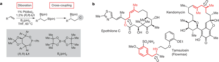 The catalytic enantioselective diboration of terminal alkenes, combined with Pd-catalysed cross-coupling, provides aflexible platform for the construction of a broad array of chiral compounds from non-functionalized terminal alkenes. Although application of this methodology in target-oriented synthesis is easy to foresee, when one considers the tremendous variety of a-olefins and aryl/vinyl electrophiles that are available, the DCC reaction sequence should also provide new strategies for diversity-based synthesis. In addition to its direct impact on molecular synthesis, the studies presented here define a unique reactivity characteristic of 1,2-bis(pinacol boronates). We anticipate that the enhanced reactivity of the 1,2-bis(boronate) in transmetallation reactions may enable a range of other important enantioselective terminal alkene transformations that will have an impact on the field of chemical synthesis.