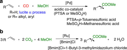 This work demonstrate the feasibility to use carbon dioxide and alcohols for alkoxycarbonylation processes of olefins without any additional strong reductant. A number of aliphatic olefins as well as styrenes can be transformed in high yields to industrially relevant carboxylic acid esters, for example, methyl propionate. In this process, carbon dioxide is reduced by the parent alcohol using convenient triruthenium dodecacarbonyl. The present catalyst system does not need any sensitive ligands or expensive additives. Notably, in the current ruthenium-catalysed alkoxycarbonylation process, the use of carbon dioxide and alcohols works much better than the combination of carbon monoxide and alcohols. Conceptually, it is shown that toxic carbon monoxide can be replaced by CO2. We estimate that this novel methodology is applicable to other carbonylation reactions too. Therefore, we anticipate that this work will contribute substantially to the development of next-generation CO2 utilization.