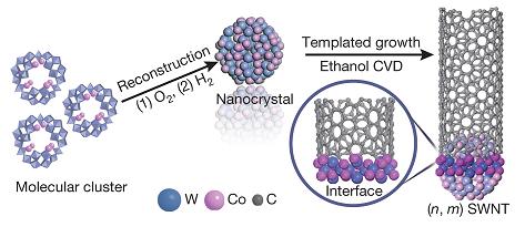Carbon nanotubes have many material properties that make them attractive for applications. In the context of nanoelectronics, interest has focused on single-walled carbon nanotubes (SWNTs) because slight changes in tube diameter and wrapping angle, defined by the chirality indices (n,m), will shift their electrical conductivity from one characteristic of a metallic state to one characteristic of a semiconducting state, and will also change the bandgap. However, this structure–function relationship can be fully exploited only with structurally pure SWNTs. Solution-based separation methods yield tubes within a narrow structure range, but the ultimate goal of producing just one type of SWNT by controlling its structure during growth has proved to be a considerable challenge over the last two decades. Such efforts aim to optimize the composition or shape of the catalyst particles that are used in the chemical vapour deposition synthesis process to decompose the carbon feedstock andinfluence SWNT nucleation and growth. This approach resulted in the highest reported proportion, 55 per cent, of single-chirality SWNTs in an as-grown sample. Here we show that SWNTs of a single chirality, (12, 6), can be produced directly with an abundance higher than 92 per centwhen using tungsten-based bimetallic alloy nanocrystals as catalysts. These, unlike other catalysts used so far, have such high melting points that they maintain their crystalline structure during the chemical vapour deposition process. This feature seems crucial because experiment and simulation both suggest that the highly selective growth of (12, 6) SWNTs is the result of a good structural match between the carbon atom arrangement around the nanotube circumference and the arrangement of the catalytically active atoms in one of the planes of the nanocrystal catalyst.We anticipate that using high-melting-point alloy nanocrystals with optimized structures as catalysts paves the way for total chirality control in SWNT growth and will thus promote the development of SWNT applications.