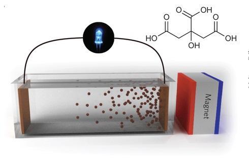 A concentration cell is composed of two equivalent half-cells made of the same material but differing in the concentration of reactants. As these concentrations equilibrate, the increase in entropy is converted into a flow of electricity with the voltage output determined by the Nernst equation and proportional to the logarithm of the concentration ratios. However, as diffusion constantly strives to erase all concentration gradients, concentration cells produce only moderate voltages (typically tens of millivolts at room temperature7, 8) over relatively short times9 and, consequently, such devices have not been regarded as promising for energy storage. Here, we report a concentration cell that produces significantly higher voltages (∼0.5 V) for over 100 h. The key to our design is that the citric acid molecules involved in the electrode reactions are tethered onto magnetic nanoparticles, and a sharp gradient (107–1011 anode/cathode concentration ratio) is maintained at one of the electrodes by a permanent magnet external to the cell. Our cell does not result in corrosion of the electrodes, produces no harmful by-products, and can be regenerated by recoating used nanoparticles with fresh citric acid. We show that a series of such centimetre-sized cells produces enough electricity to power small electronic devices (timers and calculators) for several tens of hours. Our results illustrate how redox-active molecules that are, in themselves, non-magnetic can be effectively concentrated by magnetic fields to produce electrical energy.