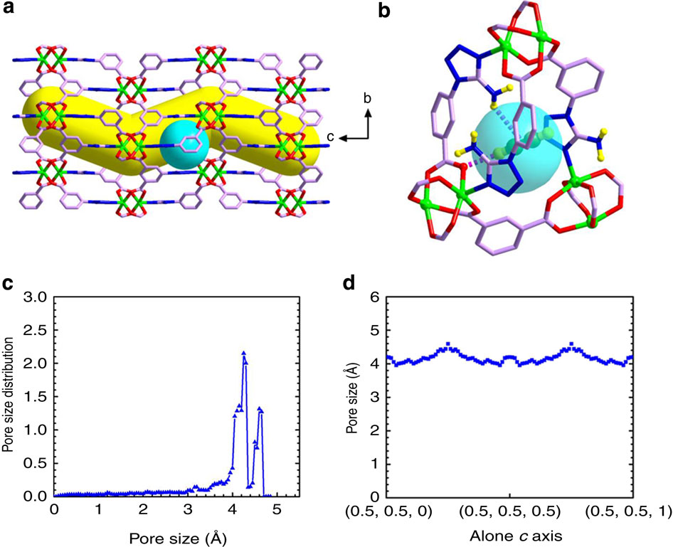 The removal of acetylene from ethylene/acetylene mixtures containing 1% acetylene is a technologically very important, but highly challenging task. Current removal approaches include the partial hydrogenation over a noble metal catalyst and the solvent extraction of cracked olefins, both of which are cost and energy consumptive. Here we report a microporous metal–organic framework in which the suitable pore/cage spaces preferentially take up much more acetylene than ethylene while the functional amine groups on the pore/cage surfaces further enforce their interactions with acetylene molecules, leading to its superior performance for this separation. The single X-ray diffraction studies, temperature dependent gas sorption isotherms, simulated and experimental column breakthrough curves and molecular simulation studies collaboratively support the claim, underlying the potential of this material for the industrial usage of the removal of acetylene from ethylene/acetylene mixtures containing 1% acetylene at room temperature through the cost- and energy-efficient adsorption separation process.