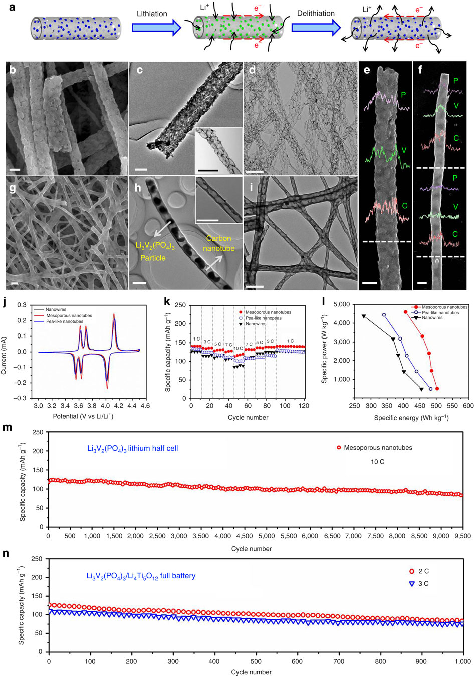Nanowires and nanotubes have been the focus of considerable efforts in energy storage and solar energy conversion because of their unique properties. However, owing to the limitations of synthetic methods, most inorganic nanotubes, especially for multi-element oxides and binary-metal oxides, have been rarely fabricated. Here we design a gradient electrospinning and controlled pyrolysis method to synthesize various controllable 1D nanostructures, including mesoporous nanotubes, pea-like nanotubes and continuous nanowires. The key point of this method is the gradient distribution of low-/middle-/high-molecular-weight poly(vinyl alcohol) during the electrospinning process. This simple technique is extended to various inorganic multi-element oxides, binary-metal oxides and single-metal oxides. Among them, Li3V2(PO4)3, Na0.7Fe0.7Mn0.3O2 and Co3O4 mesoporous nanotubes exhibit ultrastable electrochemical performance when used in lithium-ion batteries, sodium-ion batteries and supercapacitors, respectively. We believe that a wide range of new materials available from our composition gradient electrospinning and pyrolysis methodology may lead to further developments in research on 1D systems.