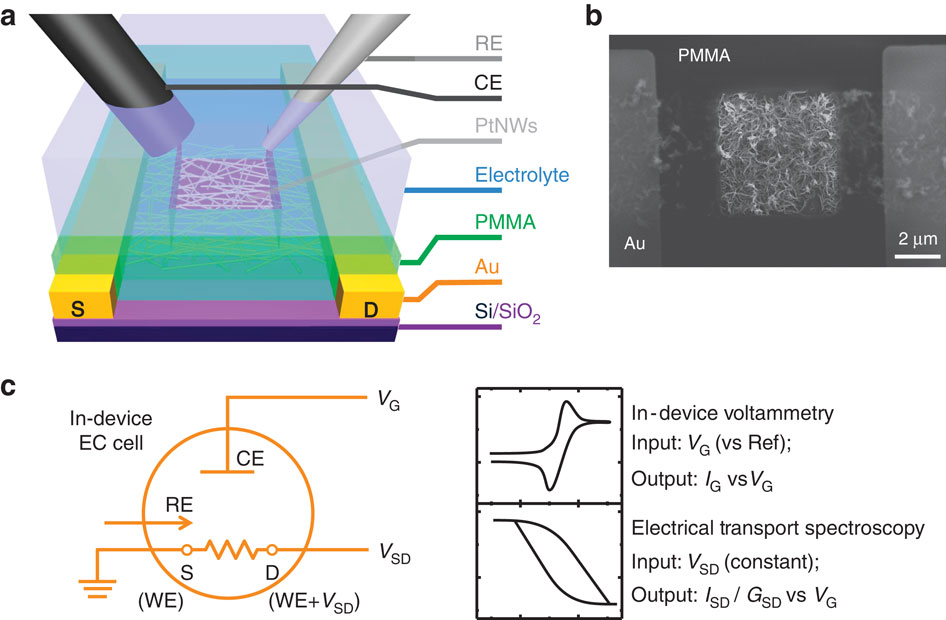In situ monitoring electrochemical interfaces is crucial for fundamental understanding and continued optimization of electrocatalysts. Conventional spectroscopic techniques are generally difficult to implement for in situ electrochemical studies. Here we report an on-chip electrical transport spectroscopy approach for directly probing the electrochemical surfaces of metallic nanocatalysts in action. With a four-electrode device configuration, we demonstrate that the electrical properties of ultrafine platinum nanowires are highly sensitive and selective to the electrochemical surface states, enabling a nanoelectronic signalling pathway that reveals electrochemical interface information during in-device cyclic voltammetry. Our results not only show a high degree of consistency with generally accepted conclusions in platinum electrochemistry but also offer important insights on various practically important electrochemical reactions. This study defines a nanoelectronic strategy for in situ electrochemical surface studies with high surface sensitivity and surface specificity.
